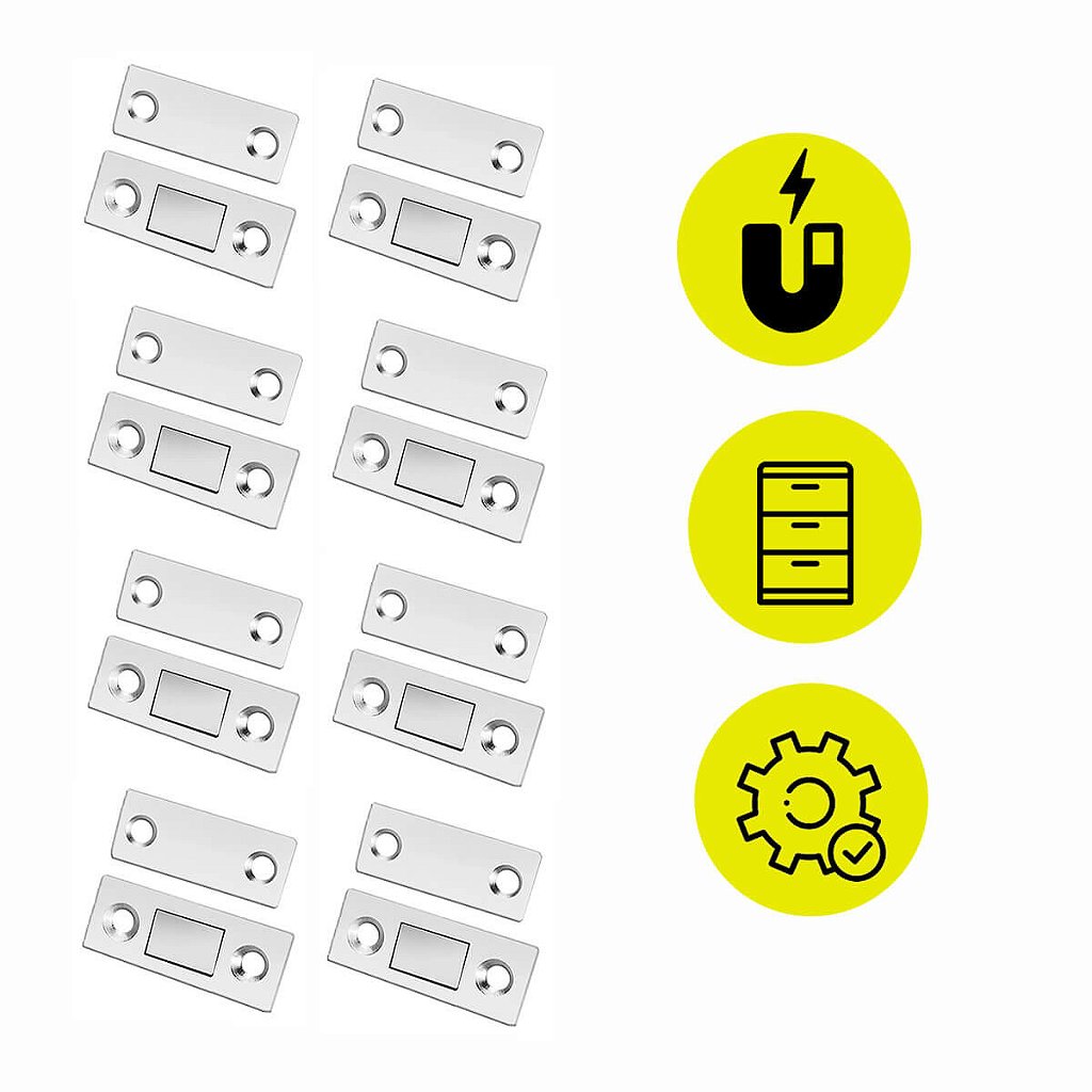 Com o conjunto de 8 fechos magnéticos, junto com fitas dupla face para instalação sem furos, ou utilize os parafusos incluídos para uma montagem mais tradicional.